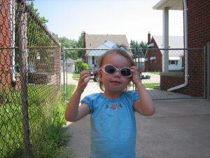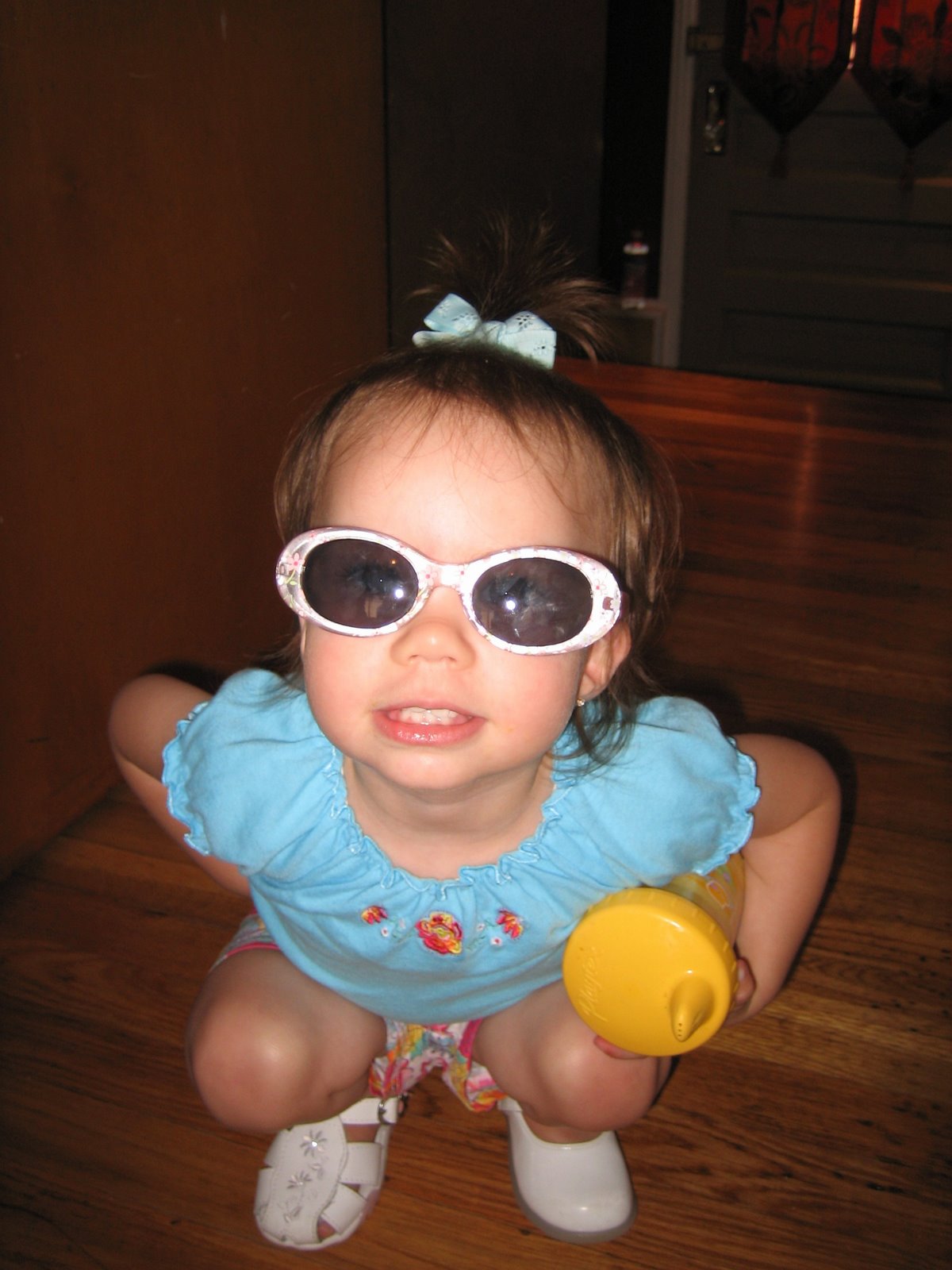 2 different shoes on the wrong feet and fingerprints all over her sunglasses