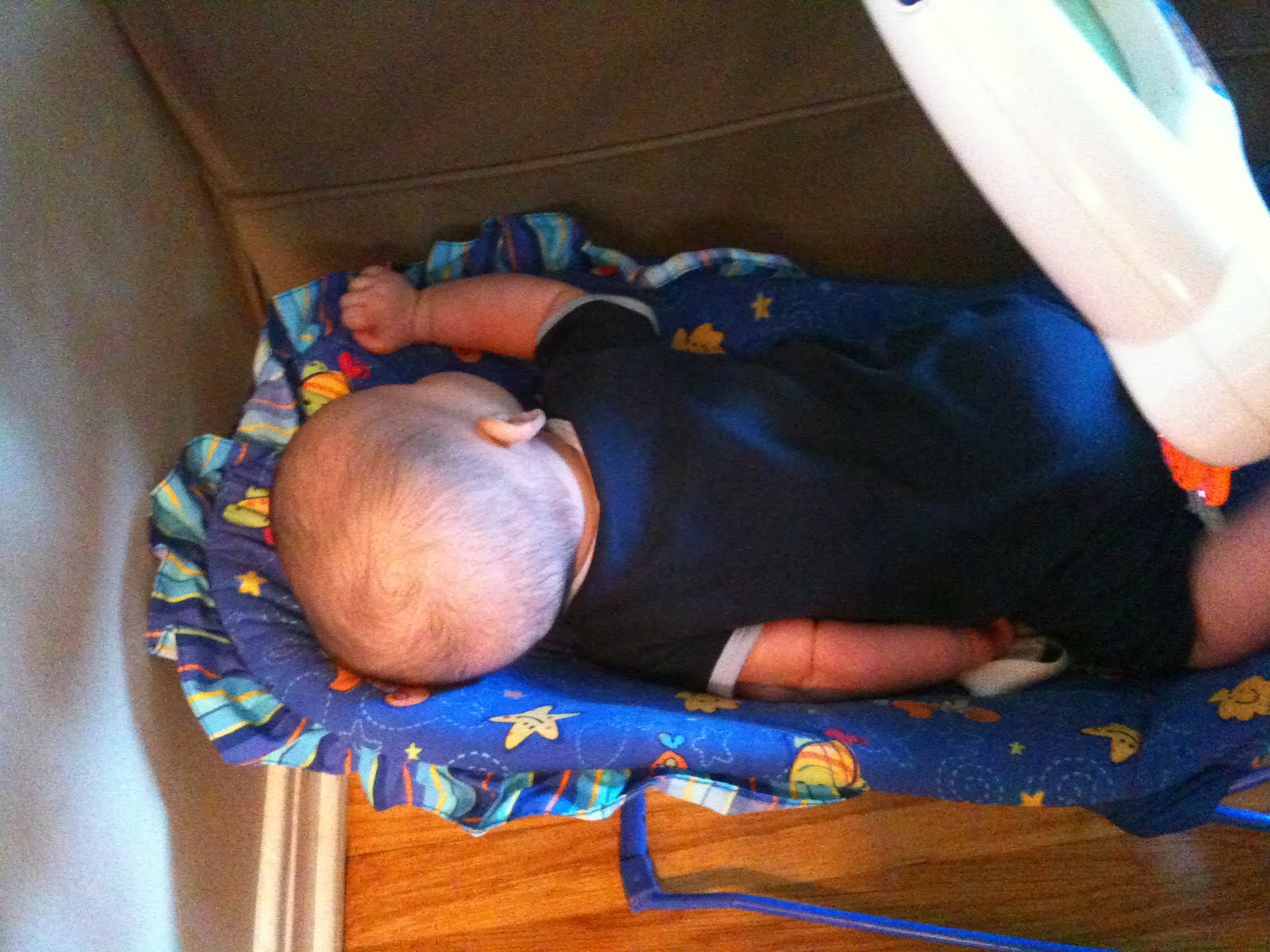 1. I have the same bouncer…somehow my moment of “lets buckle em up” was always in the seat the right way but sliding down so far that their butt was almost on the ground over the front and their little head was moments from sliding off and hitting the ground. You're little guy let you know in a much more comfy looking way.